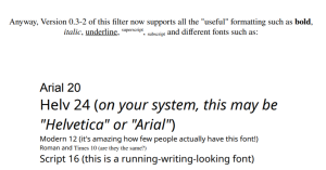 The actual text begins at byte 128. The formatting (bold, italics, font size, etc.) is stored separately in a FormatInfoPage. This contains so-called FormatPointers, which specify which text area receives which formatting.[3]